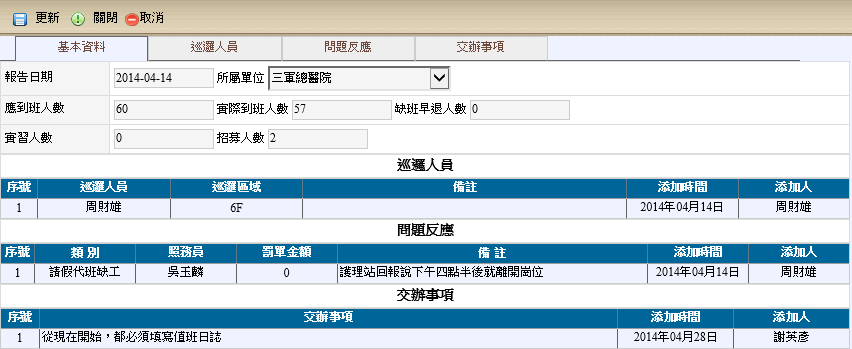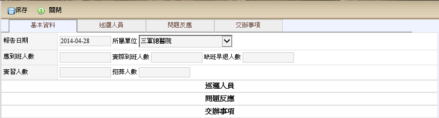 新增值班日誌,每日每間醫院只能增加一筆,應到班、實際到班、缺班早退、實習人數(主要是針對團體班、公班、護佐班)、招募人數,完畢後點選保存。