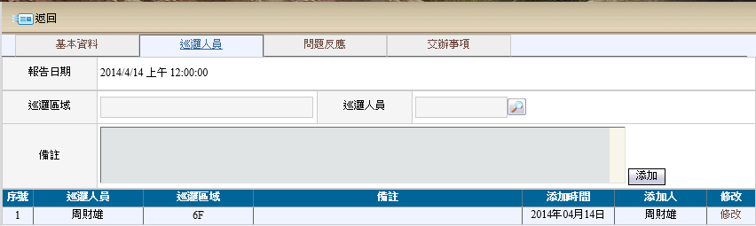 巡邏人員主要是填寫巡邏人員之樓層、區域、病房號碼等,須確實填寫。