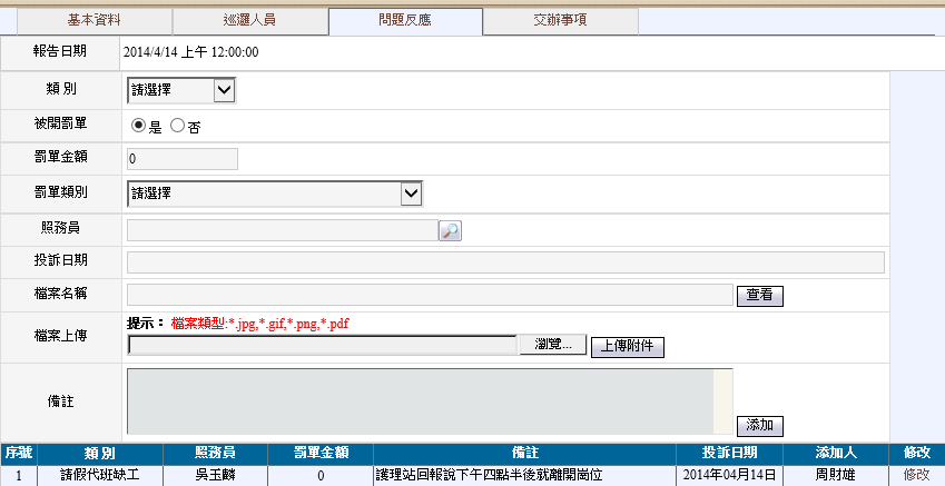 問題反應主要則是針對投訴、罰單進行登記,先填寫類別,然後再選擇是否被開罰單,罰單金額多少、罰單類別、照服員、投訴日期,所被開立之罰單將一律進行掃描上傳,備註擇是針對本張罰單或者投訴進行註記。