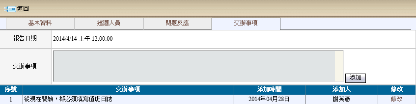 交辦事項,主要是針對值班過程中,任何狀況需要說明或交接的進行填寫,愈能描述清楚愈佳,否則隔天值班人員進行調閱時,很多事情都會不瞭解。