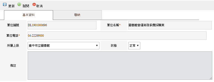 點選添加後,或是查看可以進入此頁面,單位編號為自動產生,單位名稱,根據得士派規劃,主要為組室或臨時編組或專案名稱,單位電話可以輸入分機或是專線,狀態主要是正常或者是停用,停用將不再顯示,所屬上級為必要欄位,必須填寫,備註則是補充說明其相關內容或細節。