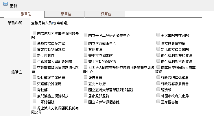 選擇單位設置,將會出現此頁面,請注意:此頁面主要是設定該職務所能看到的人員清單,例如:選了一級的任何一個單位,便可以看見該單位向下所有的職缺,其中也包含了該一級單位所有的二級及三級單位全部,選了二級的任何一個單位,便可看到該二級單位的任一三級單位,以此類推,但是如果需要使用各項單據,例如請假單,必須填寫職務代理人時,至少要選擇自己所屬的單位,本功能設置時,有可能會有個資法的問題,請謹慎使用。