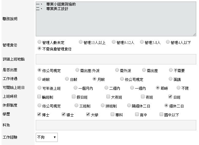 工作經驗:主要是外網招聘廣告註記用。
