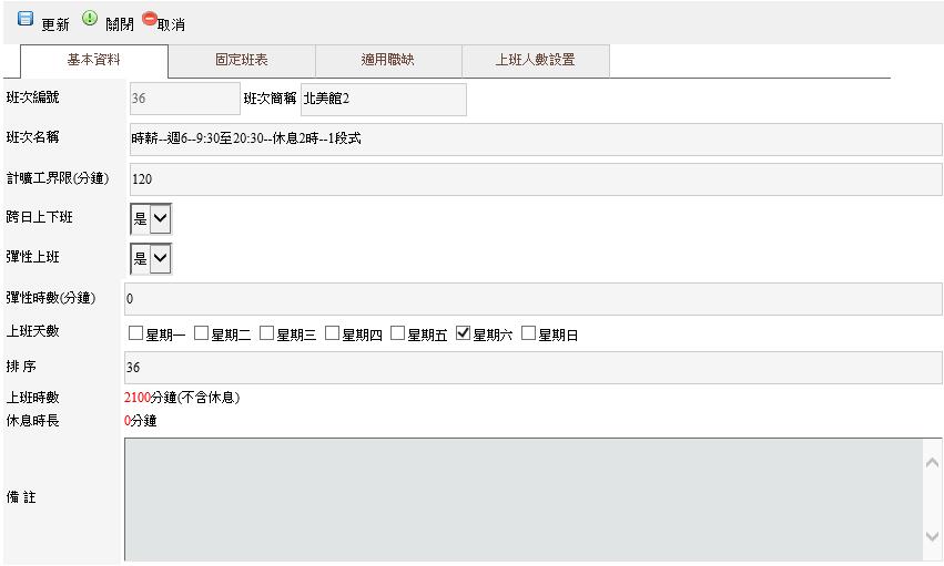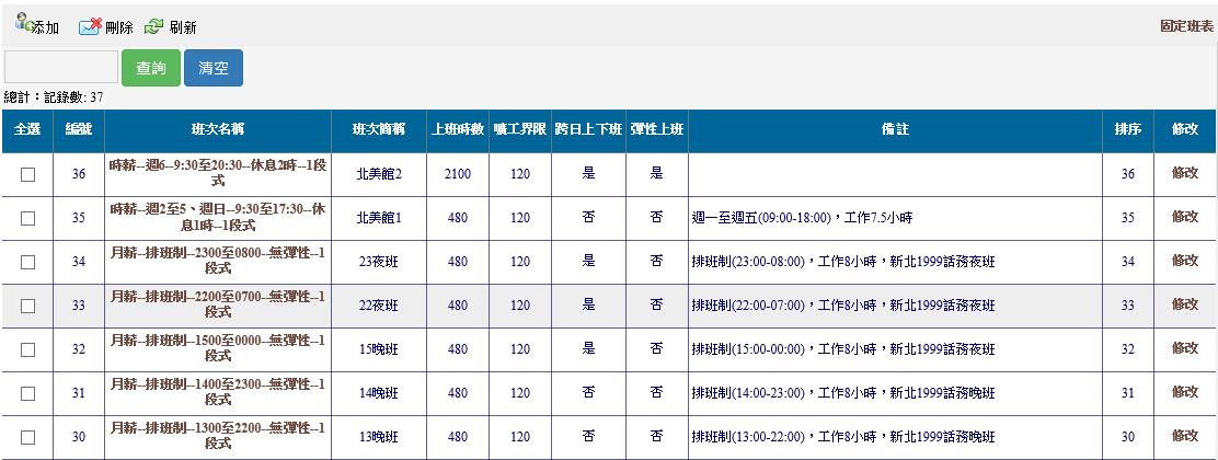 班次編號:針對班次訂定一個編號,通常為流水編號,各班段不能相同。