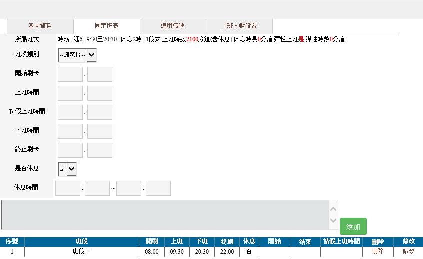 1.新增班別:管理人員可針對特殊需求設定不同條件性質的班表,例如:8小時制班表、12小時制班表等。