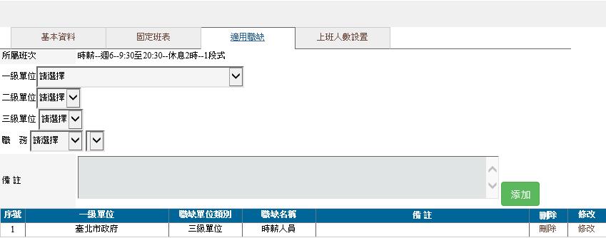 可以針對系統各種直接進行綁定,每種職缺只能選擇一種固定班表,系統設定完畢,爾後以此規則進行比對,是否有違反該規則。