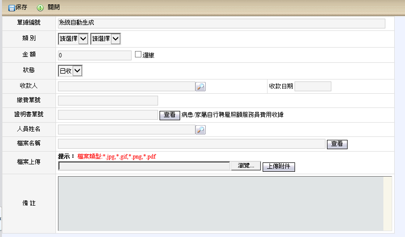 收取押金時,請填寫相關欄位,例如金額、狀態、繳費單號等等,任何押金請於照顧服務員繳交時立即填寫