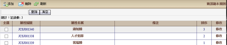 簡訊範本類別,主要是將簡訊範本進行分類,方便提取範本簡訊時,容易找尋到想要使用之範本進行修改發送。