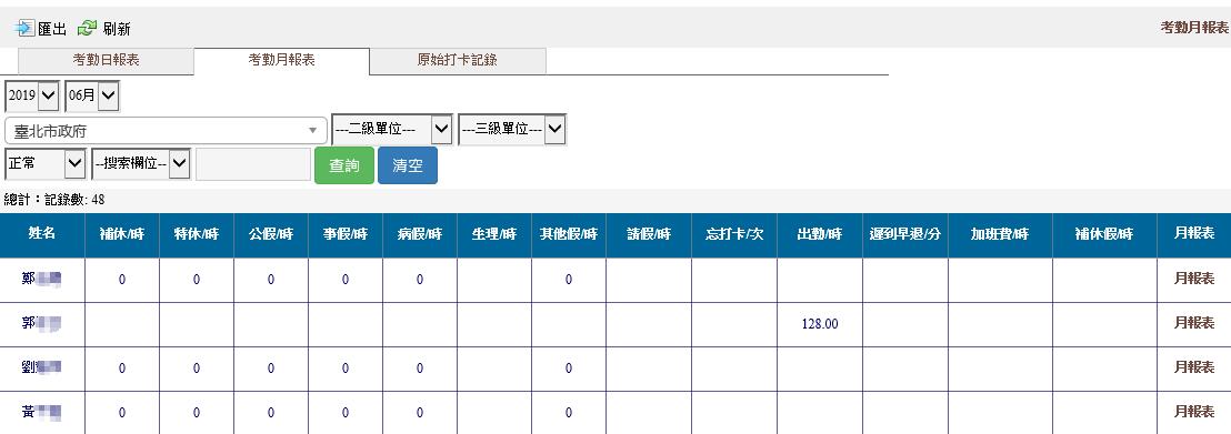考勤月報表目前設計為每小時重新整理一次,大約為每小時15-30間進行。