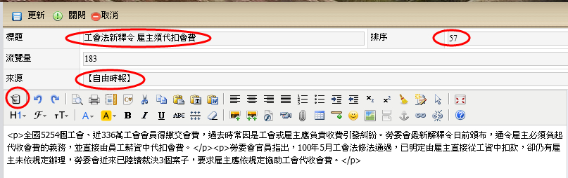 通常黏貼之新聞,主要來源為yahoo新聞,請選擇財經類,與人力資源相關之新聞,秘訣在於盡量不要轉貼有關同業之報導,例如:就業情報、1111人力銀行等相關新聞,或是將其修改為某人力公司之文字,與派遣有關之負面新聞也不採納,複製完新聞內容後先貼上記事本,主要用意在於消除一些html語法,完畢後再行貼入,貼入前請切換至純文字模式。
