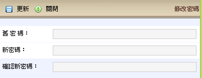 1.可以變更使用者之密碼,首先輸入舊密碼,輸入完成後再輸入新密碼,輸入新密碼後再次確認新密碼,兩次新密碼皆要相同,完成後點選更新便完成修改密碼程序。