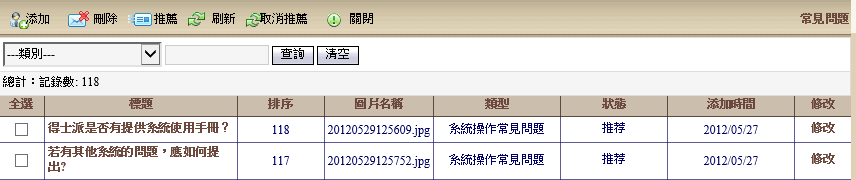 添加可以進行常見問題添加,刪除可以針對該筆常見問題進行刪除,推薦可以將主要文章進行外部網輪播,取消推薦就是將外部網輪播拿掉,關閉就是指關閉其頁面。