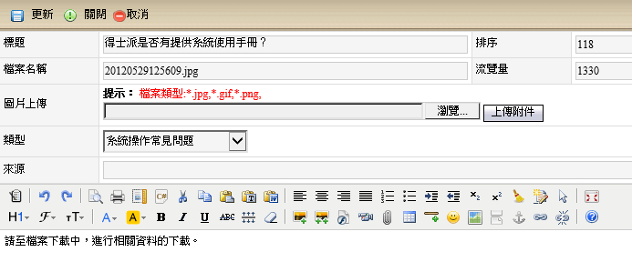 新增後填寫標題,填寫完畢後進行填入該問題之排序位置,瀏覽量可自行添加或者用預設值,圖片上傳的部份,指外網輪播時之小圖,建議每一問題皆須上傳圖片,倘若無上傳,未來選擇推薦輪播時, 將會出現空白,最後再將問題類型進行分類,來源部份則是進行說明主要來源處。