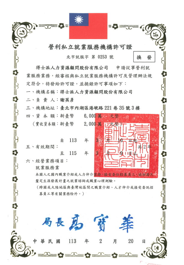 得士派具有營利私立就業服務機構許可證,許可字號:北市就服字第0253號,可經營的項目為就業服務業,業務內容包含本國人支國內職業介紹或人力仲介業務、接受委任招募員工協助國民釐定生涯發展計畫之就業諮詢或職業心理測驗。